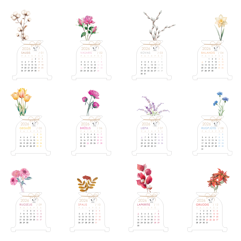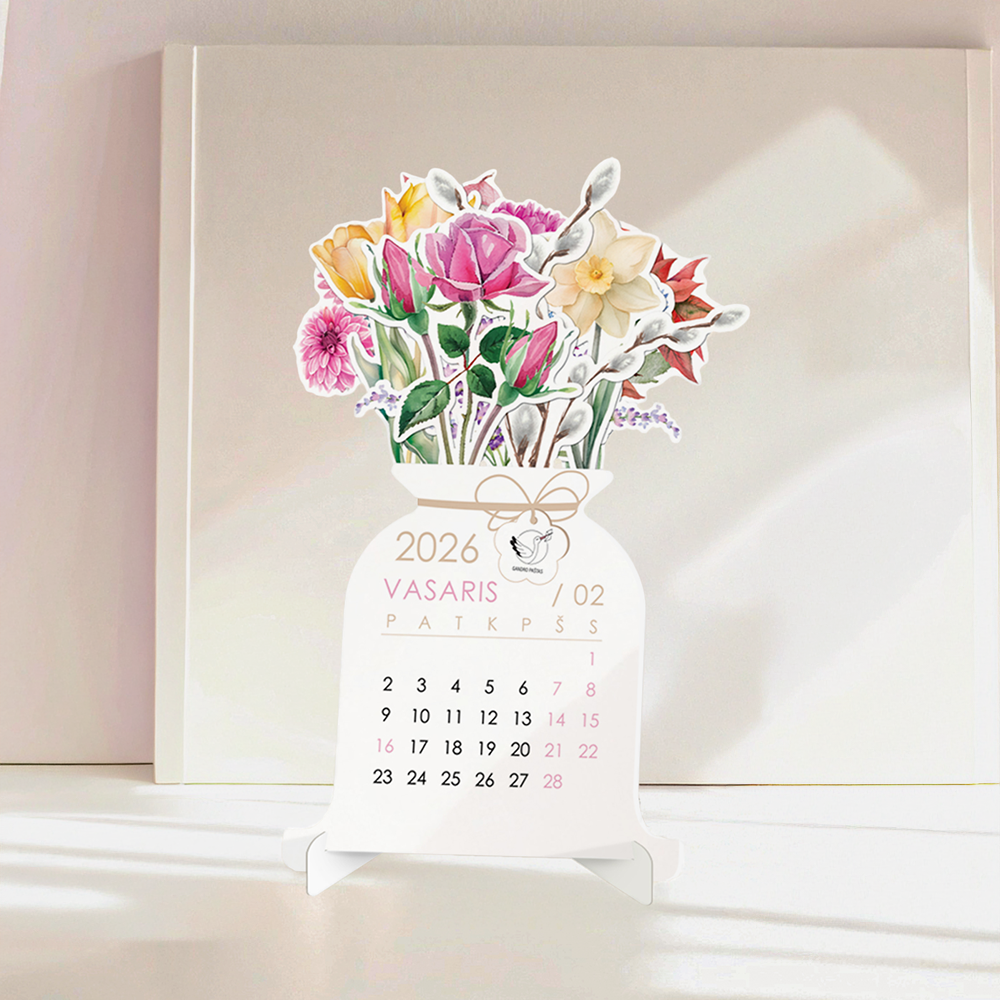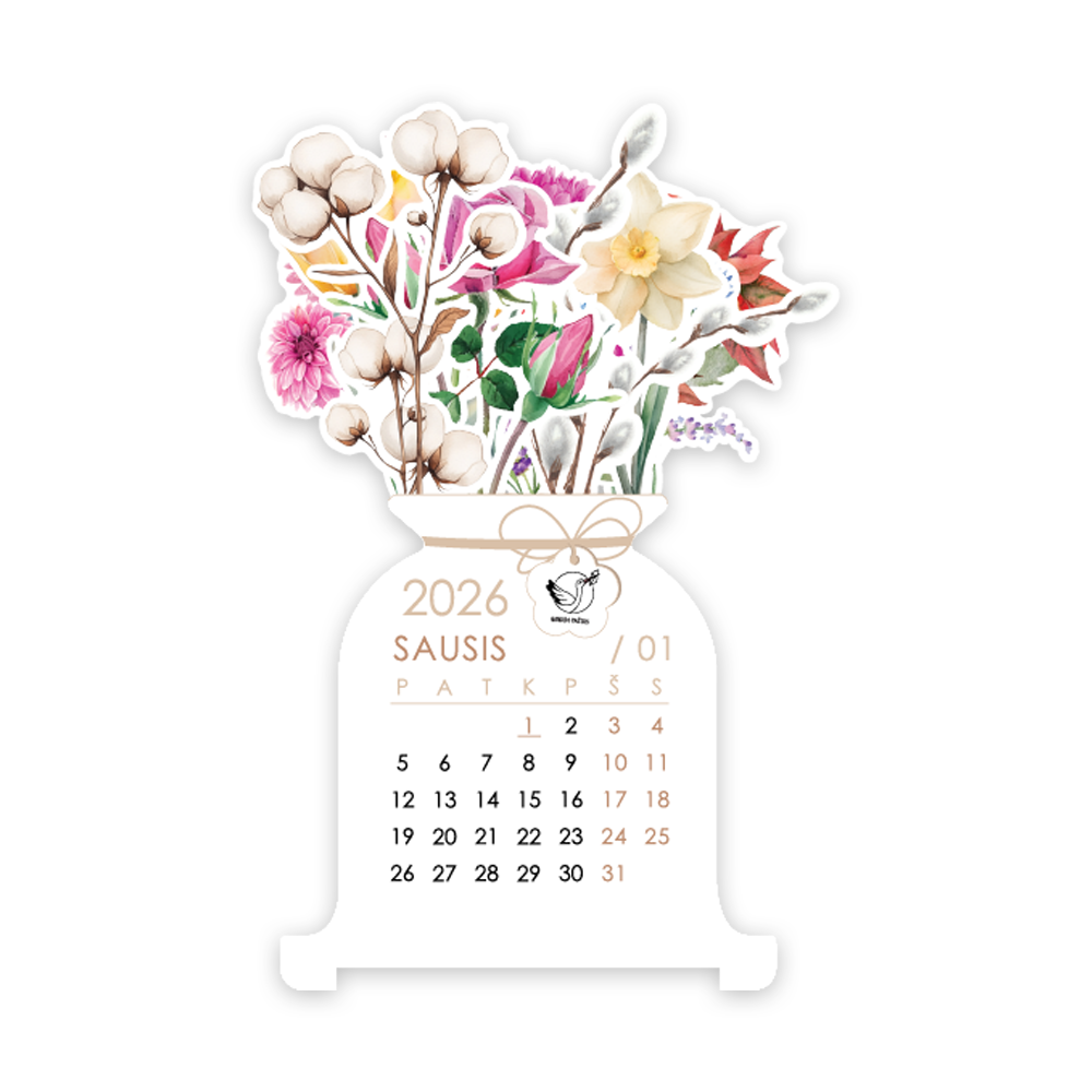 Kalendorius „Gėlių puokštė“ – tai 2026 m. stalinis kalendorius, kurį sudaro 12 kortelių su mėnesiais. Kiekvieną mėnesį vaizduojamas skirtingas gėlių žiedas atitinkantis sezoniškumą – bijūnai, levandos, rugiagėlės ir kt. Švelnių spalvų stalinis kalendorius taps ne tik praktiška, bet ir dailia dovana puošiančia jūsų namus. Padovanokite originalią, kiekvieną dieną apie jus primenančią, dovaną, kuri nenuvils.