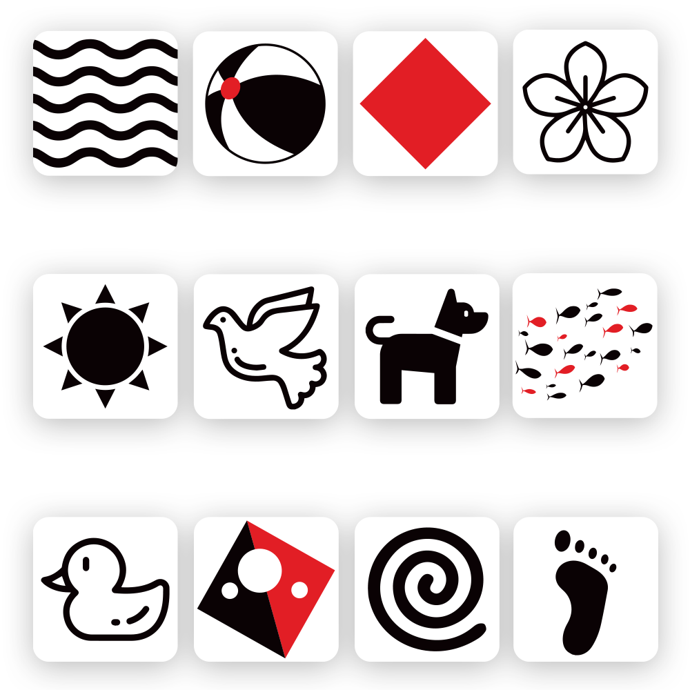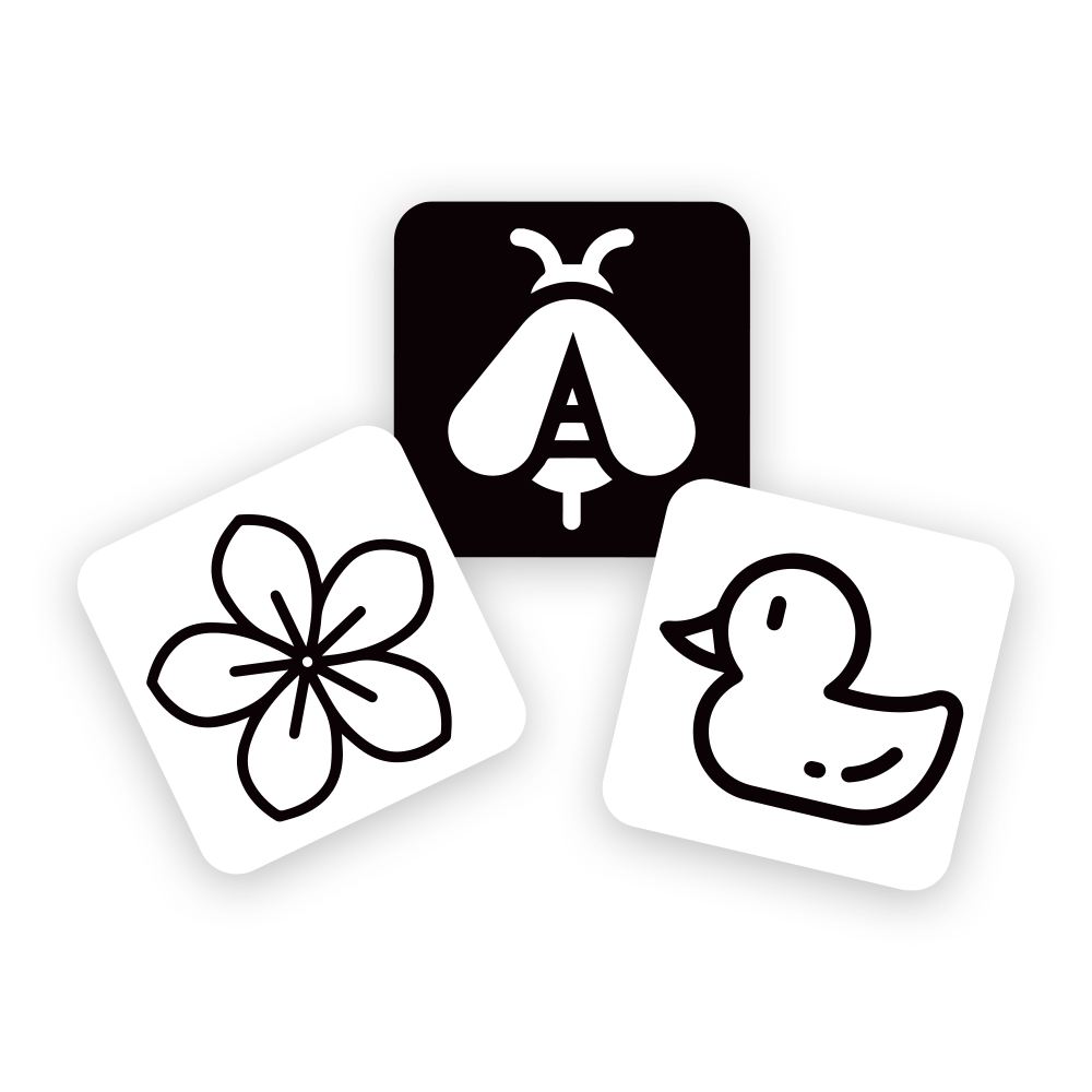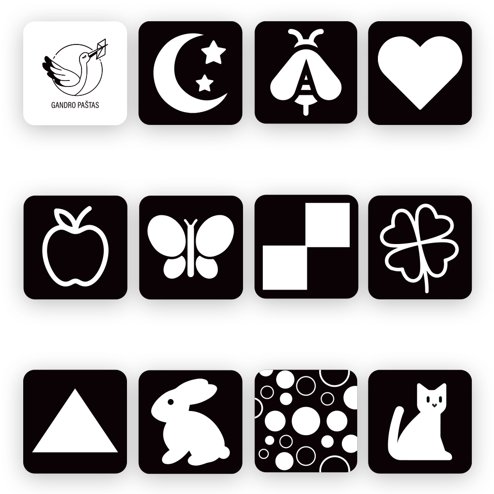 - Rinkinį sudaro 12 kortelių su kontrastiniais paveikslėliais iš abiejų pusių