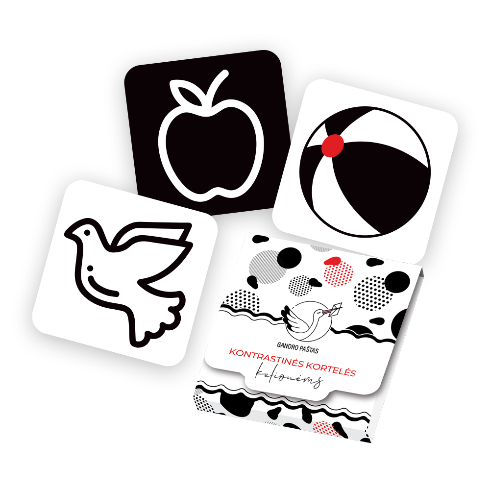 Kortelės su kontrastiniais paveikslėliais – tai ryškių ir kontrastingų spalvų bei formų piešiniai sukurti atkreipti kūdikio dėmesį ir padėti susikoncentruoti, todėl kūdikis gali ilgiau išlaikyti galvytę gulint ant pilvuko ir taip stiprinti nugaros raumenis. Kortelės ramina susierzinimą, didina smalsumą bei gebėjimą susikaupti.