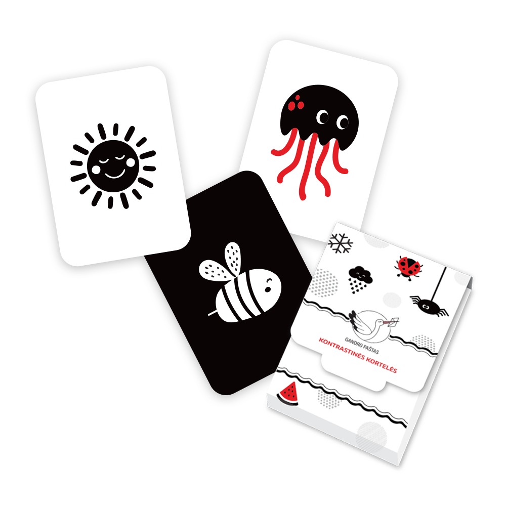 •  0-3 mėn. amžiaus kūdikiams rekomenduojama naudoti juodai baltas korteles | 3-6 mėn. mažyliams – juodos, baltos ir raudonos