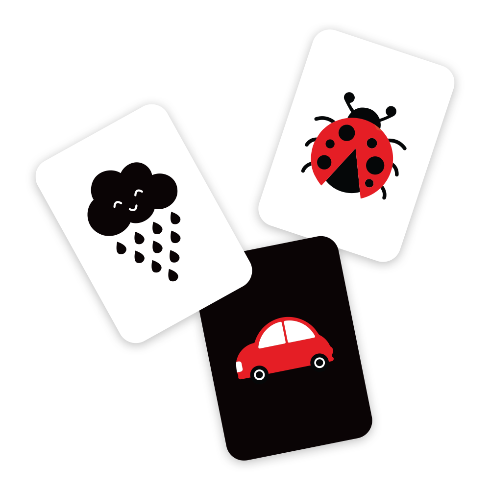 Kontrastinės kortelės su piešiniais skirti lavinti mažylio regą, mąstymą bei koncentraciją. Juodos, baltos bei raudonos spalvos kortelės su figūromis idealiai tinka laikui ant pilvuko.