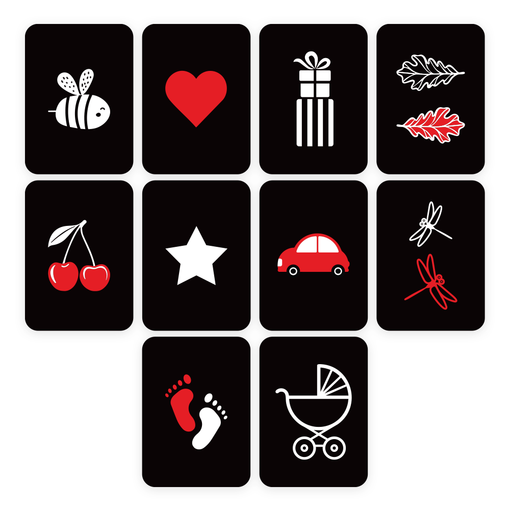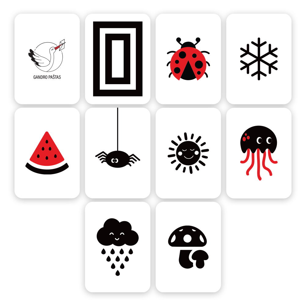 • Rinkinį sudaro 10 kortelių su kontrastiniais paveikslėliais iš abiejų pusių