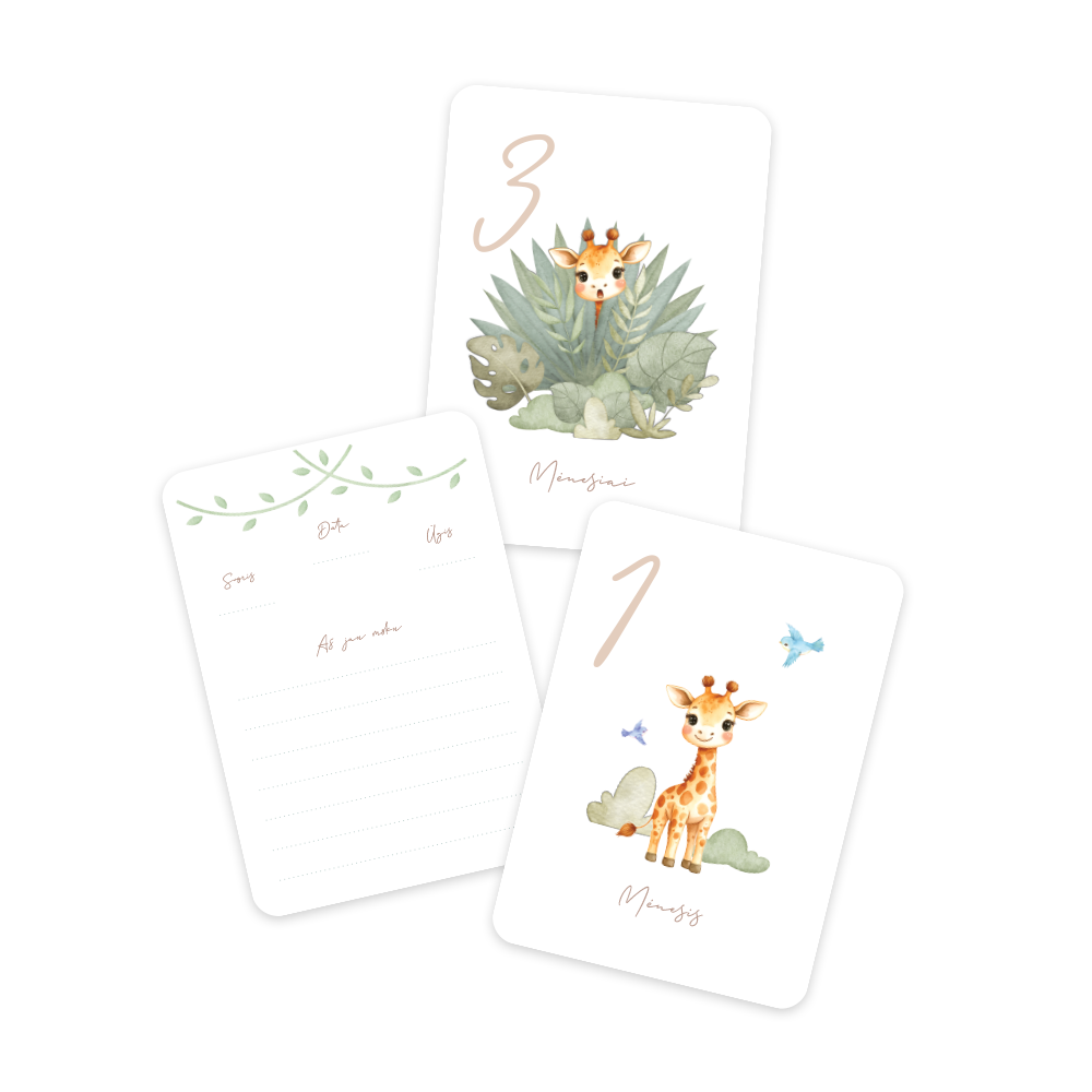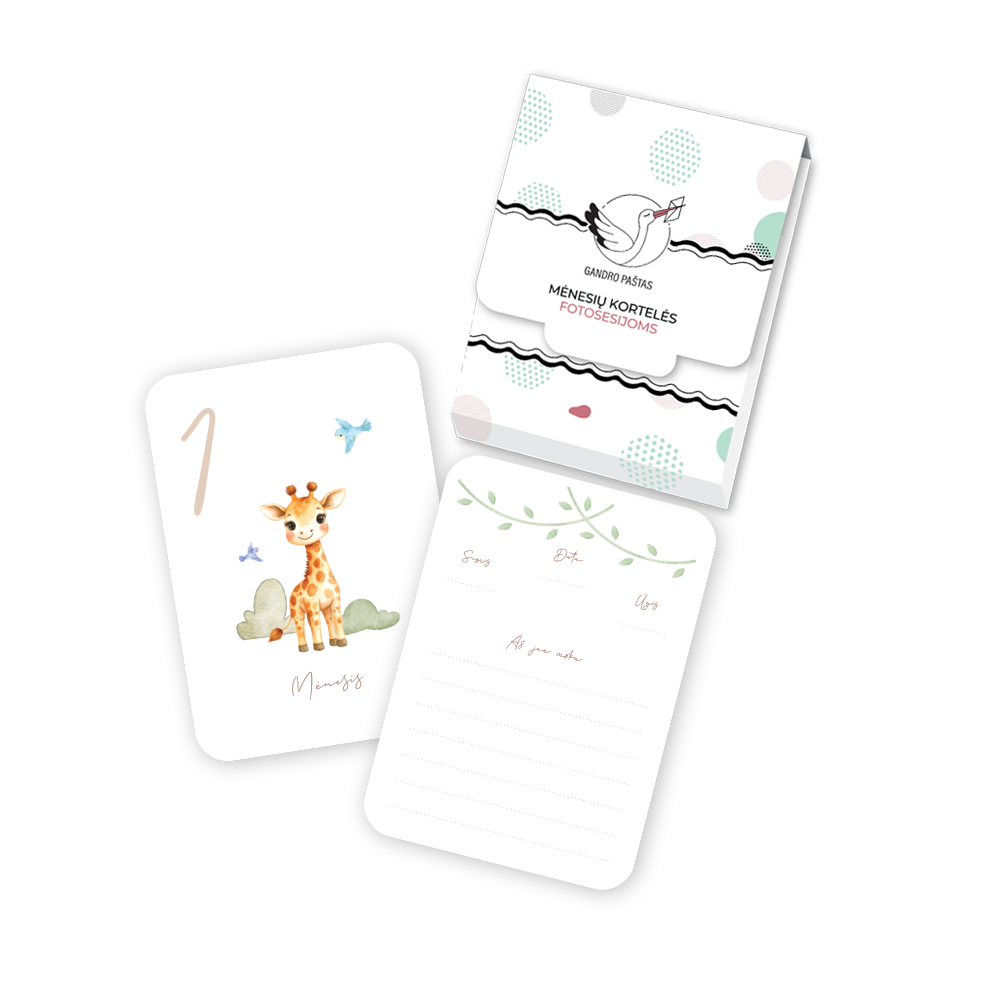 Mėnesių kortelių rinkinys – puikus būdas norintiems įamžinti pirmuosius mažylio gyvenimo mėnesius ir akimirkas. Kortelių dėka matysite kaip vaikutis keitėsi per pirmuosius 12 mėnesių, o antroje pusėje užfiksuoti pasiekimai bei augimo informacija neleis pamiršti gražiausių pirmųjų metų.