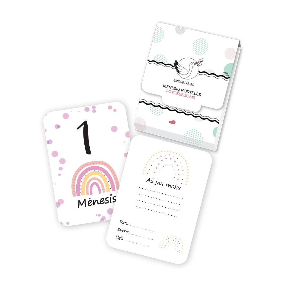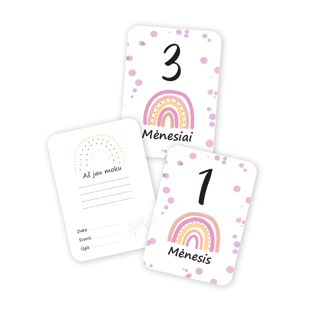 Mėnesių kortelių rinkinys – puikus būdas norintiems įamžinti pirmuosius mažylio gyvenimo mėnesius ir akimirkas. Kortelių dėka matysite kaip vaikutis keitėsi per pirmuosius 12 mėnesių, o antroje pusėje užfiksuoti pasiekimai bei augimo informacija neleis pamiršti gražiausių pirmųjų metų.