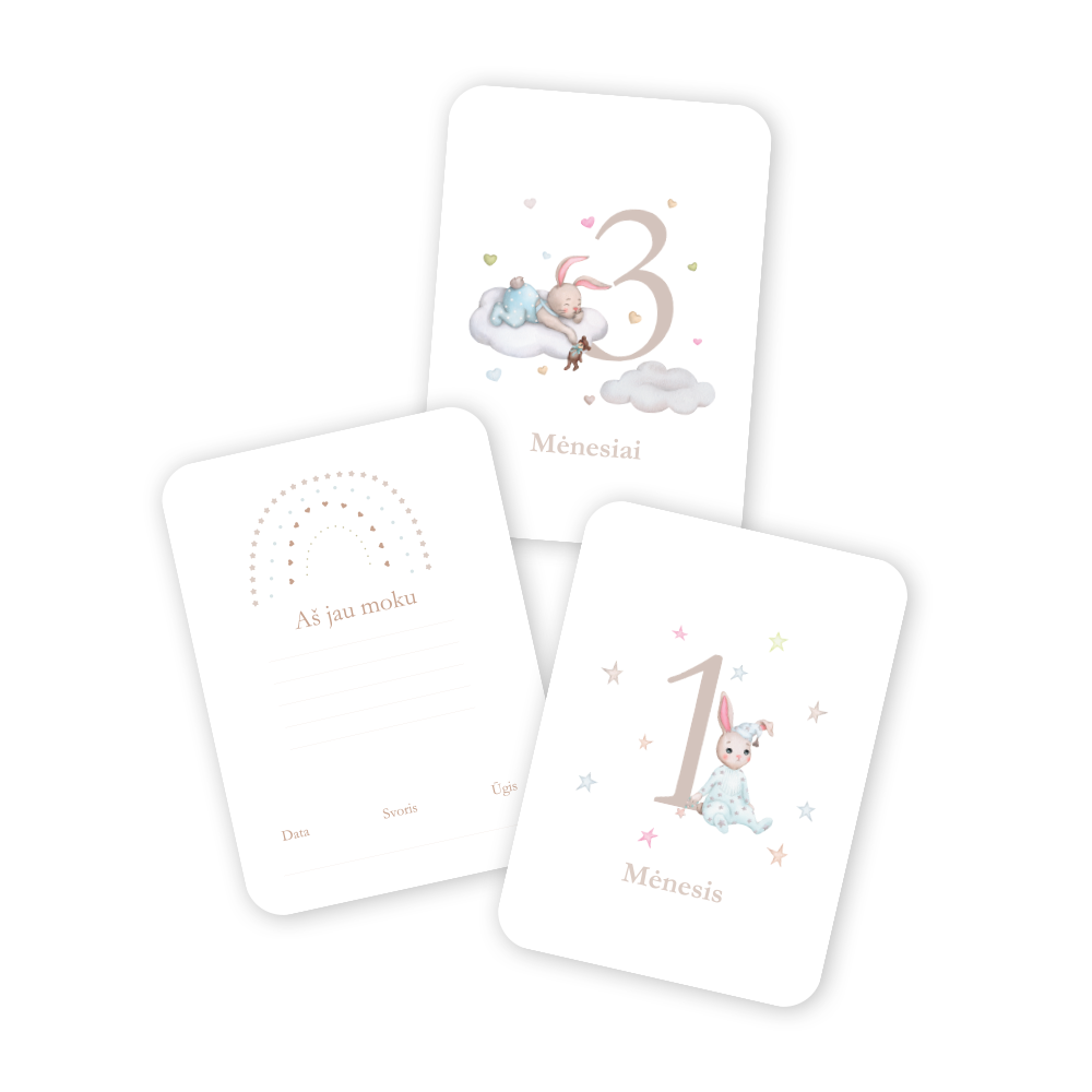 Mėnesių kortelių rinkinys – puikus būdas norintiems įamžinti pirmuosius mažylio gyvenimo mėnesius ir akimirkas. Kortelių dėka matysite kaip vaikutis keitėsi per pirmuosius 12 mėnesių, o antroje pusėje užfiksuoti pasiekimai bei augimo informacija neleis pamiršti gražiausių pirmųjų metų.