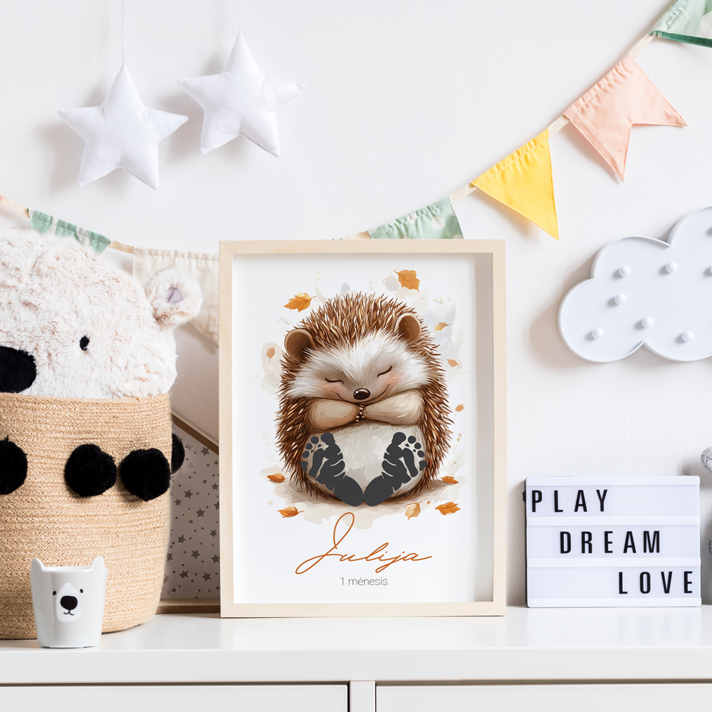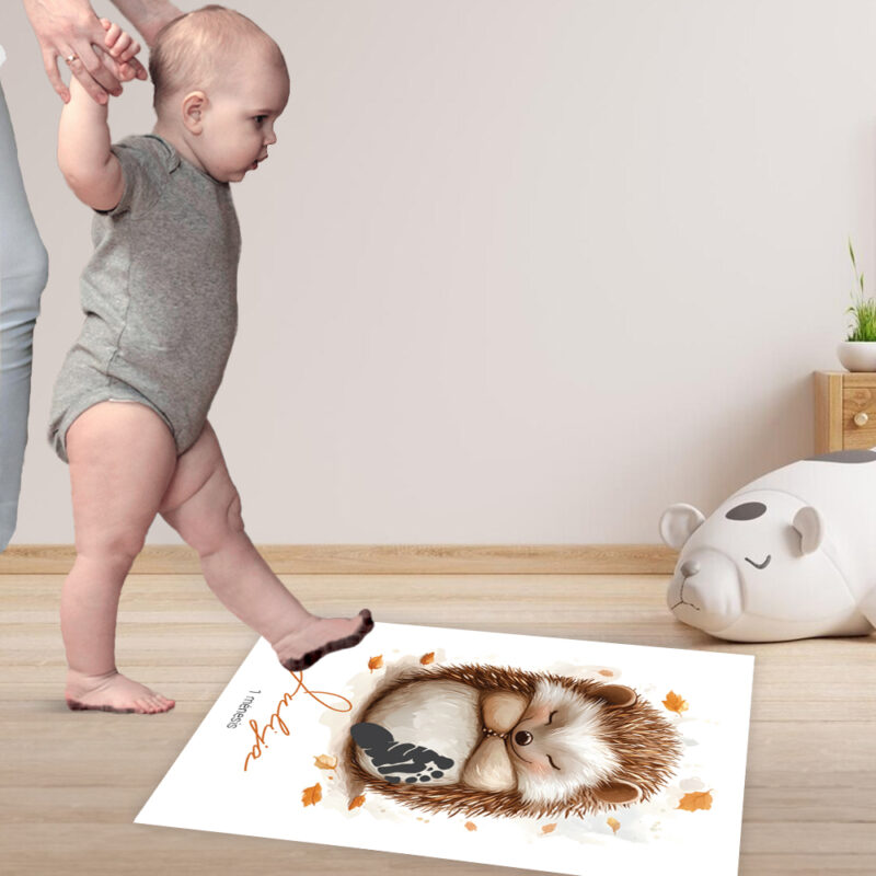 Pėdučių Įspaudų Paveikslas. Personalizuotas kūdikio pėdučių paveikslas su gyvūnų iliustracijomis – tai originali, jauki ir išskirtinė dovana tėveliams, kuri papuoš kiekvieno namus ir taps išskirtiniu prisiminimu. Pasirinkto gyvūnėlio letenėlių vietoje priglauskite vaikučio pėdutes išteptas dažais. Siekiant išgauti geriausią efektą, atkreipkite dėmesį, kad visas kojytės paviršius būdų priglaustas (prieš dedant įspaudus ant paveikslo, rekomenduojame pasibandyti ant paprasto popieriaus).