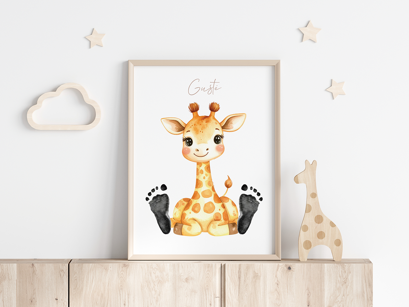 Pėdučių Įspaudų Paveikslas. Personalizuotas kūdikio pėdučių paveikslas su gyvūnų iliustracijomis – tai originali, jauki ir išskirtinė dovana tėveliams, kuri papuoš kiekvieno namus ir taps išskirtiniu prisiminimu. Pasirinkto gyvūnėlio letenėlių vietoje priglauskite vaikučio pėdutes išteptas dažais. Siekiant išgauti geriausią efektą, atkreipkite dėmesį, kad visas kojytės paviršius būdų priglaustas (prieš dedant įspaudus ant paveikslo, rekomenduojame pasibandyti ant paprasto popieriaus).
