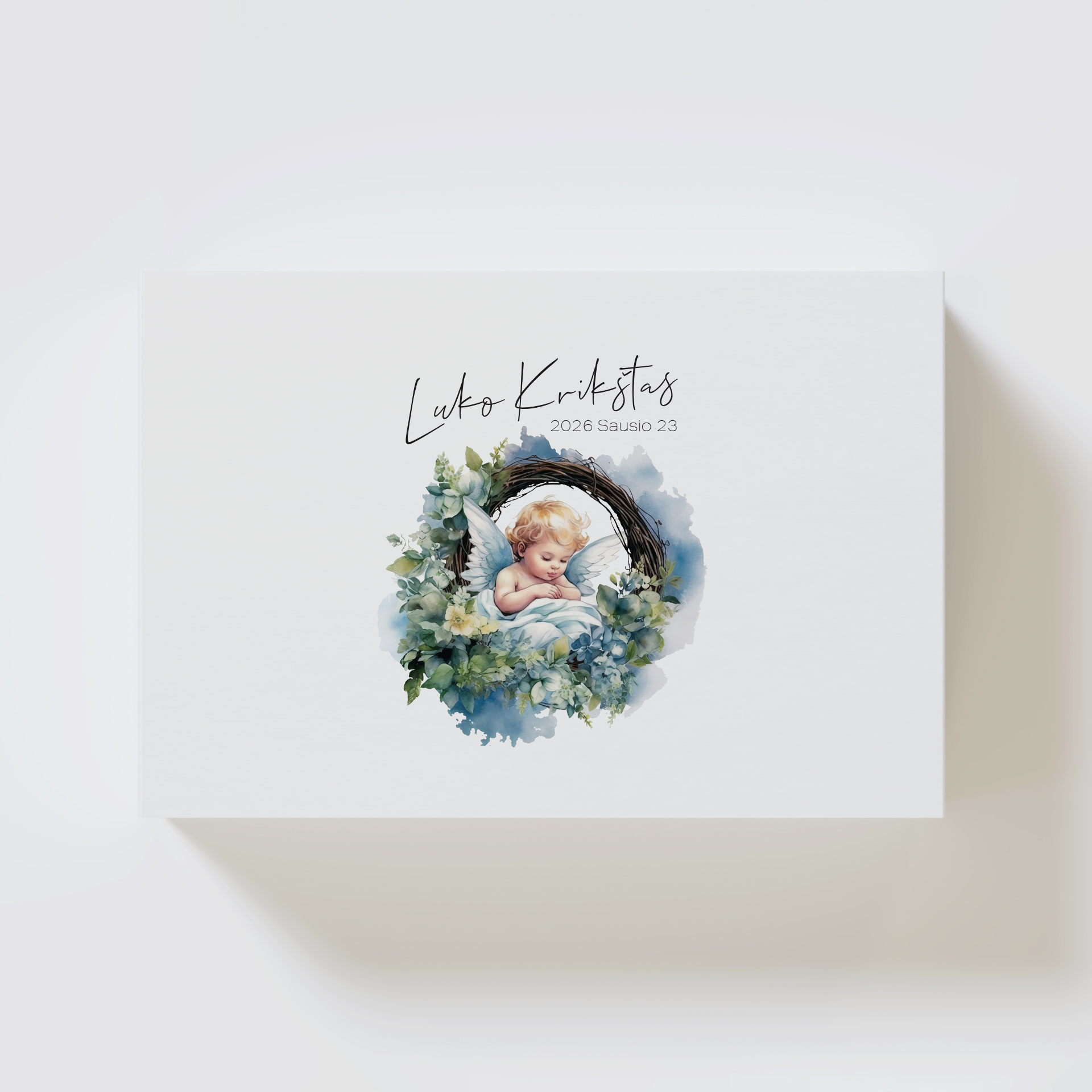 Krikšto dėžutė su pasirinkta iliustracija bei vardu – puiki dovana šeimai, skirta įamžinti tikėjimo kelionės pradžią.