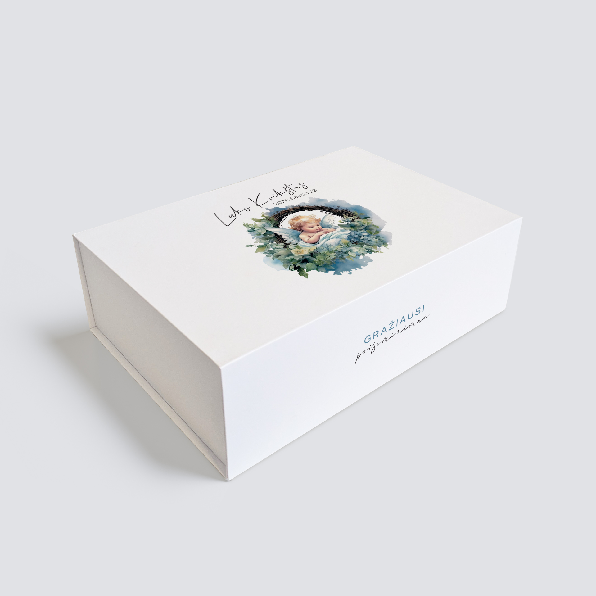 Personalizuota krikšto dėžutė – tai ypatinga dovana, kurioje telpa gražiausi prisiminimai iš svarbios šventės. Pasirinkite norimą iliustraciją su jūsų kūdikio vardu bei krikšto data, suteikdami unikalumo bei artumo jausmą. Tvirto kartono dėžutė su magnetiniais laikikliais ir švelniomis iliustracijomis saugos krikšto rūbelius, žvakę bei kitus sentimentalius prisiminimus apie jaukią šeimos šventę.
