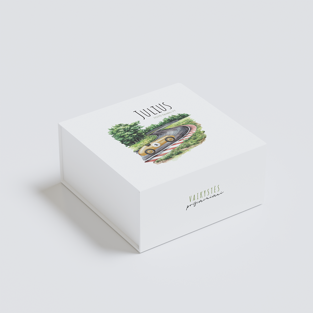 Prisiminimų Dėžutė. Ši dėžutė pasižymi su jūsų pasirinkta iliustracija ir parašytu kūdikio vardu. Tai puiki dovana šeimai, kuri nori išsaugoti visus pačius brangiausius savo mažylio prisiminimus. Tokius kaip mažylio nuotraukos, pirmieji batukai, augimo raidą žyminčios kortelės, knygelės ir kiti mieli kūdikio daikteliai.